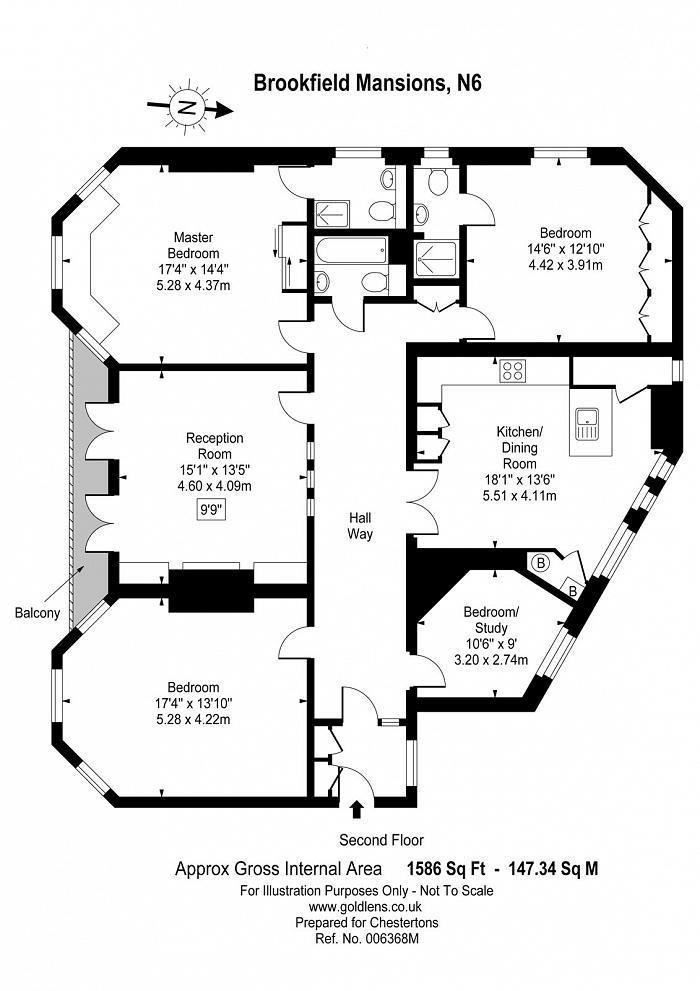 Located at the foot of Highgate West Hill and discreetly set back from the road with access from a pathway directly off of Highgate West Hill is this very spacious (1586 sq ft) SECOND FLOOR 3/4 bedroom 1/2 reception room mansion flat forming the entire second floor of this small detached Edwardian building of just four apartments and with views towards Parliament Hill Fields from the principal rooms. The apartment also has direct access via French doors to a balcony with Heath views, large ‘eat in’ kitchen, spacious dining hall, two en suite shower rooms as well as a family bathroom.